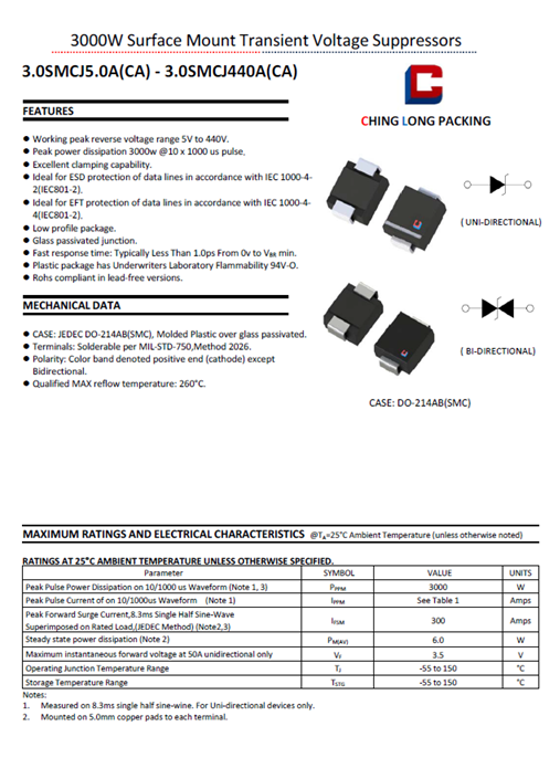3.0SMCJ5.0A(CA)~3.0SMCJ440A(CA)